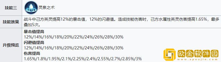 25级解锁的被动技能“灵泉之术”则在提供英灵暴击和闪避属性的基础上,额外对水属性英灵附加5次技能伤害兑换伤害提升。因此对于水系队伍来说,全水系英灵则为队伍搭配的最优解。