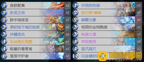 这版本控制萨得到了非常的补强,本来前期就有食人鱼解场+蛮爪洞穴稳住场面,中期还有鱼人组件的站场解场过* 一套和喜闻乐见的雪落+鹦鹉控场。现在后期不仅有吃手手还有新的“换手手”,正常打就是各种破坏对手的游戏体验,靠伯尔纳·锤喙,鹦鹉铜须反复操作,现在我理解了面对狂野战吼萨的痛苦。卡组现在还有一个前期超展开就是豺狼人+1费地标,这个combo前期也非常强,兼具突袭+超展开。