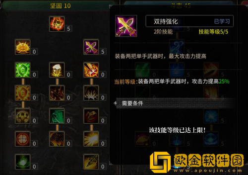 (2)玩力量战士可以先点完中间三个加力量的天赋,可以极大的提升自身的攻击,也可以提供一定的技能百分比的伤害,点完这三个之后,可以按照需求选择自己需要的技能,将“终结”栏点至30级后,点亮技能“暗爆炎强化”,强化持续伤害,让技能的伤害最大化。最后点击“坚固”栏的“双持强化”,大幅提升攻击力。