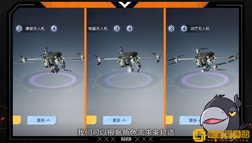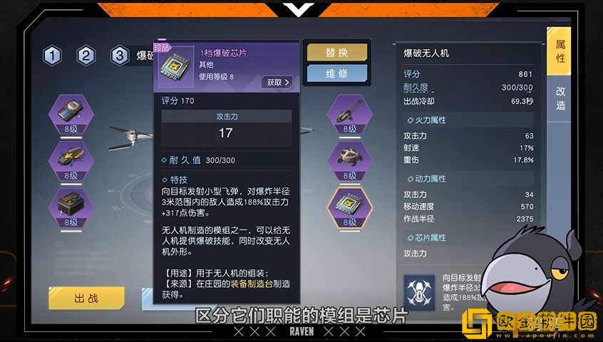 唯一不同的是【芯片】模组,包括爆破芯片、电磁芯片、治疗芯片,【芯片】模组的属性决定了成品无人机的功能。