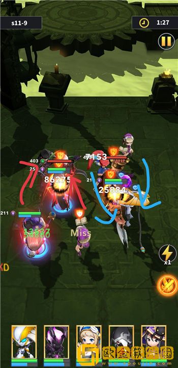 说一下我暂时从左到右来称呼我方阵容相对应的位置,我们来一倍速看看推图实际的攻击第一仇恨目标