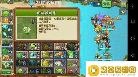 主要植物选择:回旋镖射手、莲叶、坚果、鳄梨、缠绕水草、向日葵、寒冰射手、岩浆番石榴(都尽量高阶一些,否则非常难打,像小编这样只有一阶植物的话最后会很惨烈)