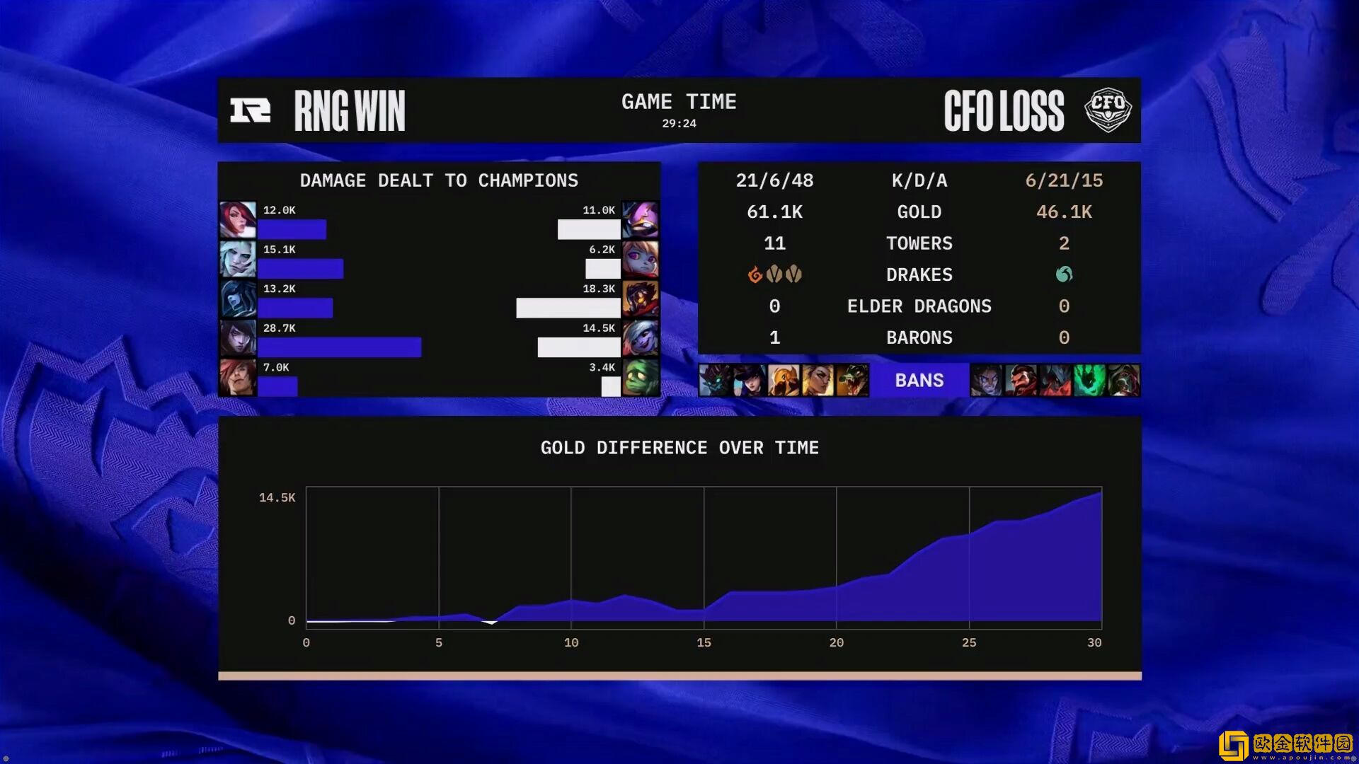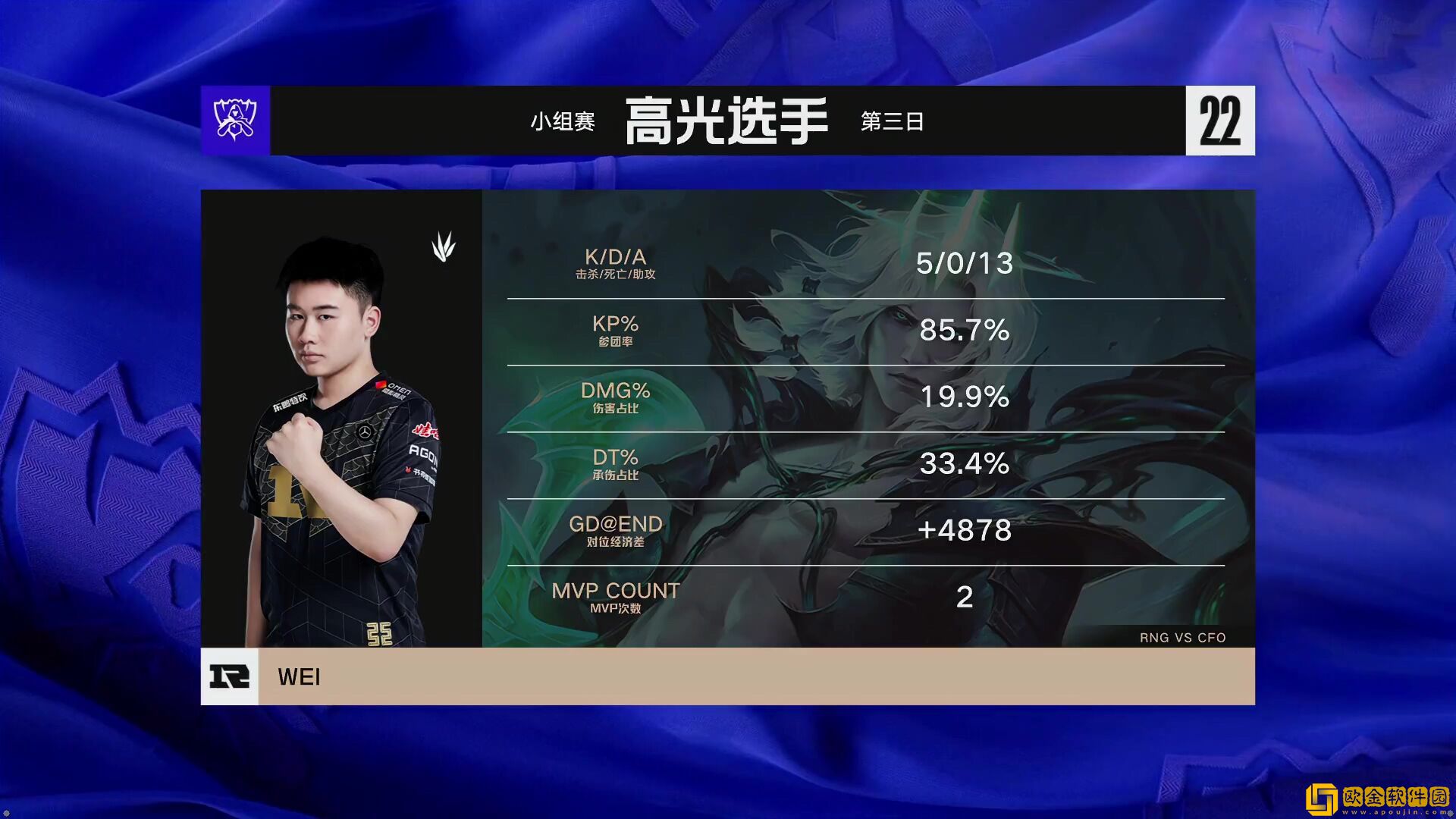 后期28分钟高地团,RNG GALA厄斐琉斯狂风向前打出巨额伤害,Xiaohu丽桑卓进场完成收割,RNG 1换3赢下团战,随后一波推平CFO基地,取得今日比赛胜利!