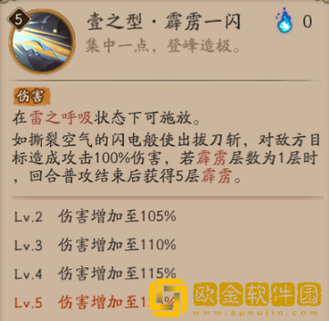 如撕裂空气的闪电般使出拔刀斩,对敌方目标造成攻击100%伤害,若【霹雳】层数为1层时,回合普攻结束后获得5层【霹雳】。