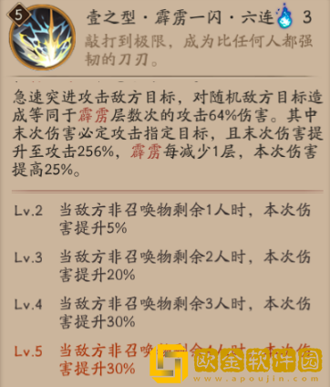 急速突进攻击敌方目标,对随机敌方目标造成等同于【霹雳】层数次的攻击64%伤害。其中末次伤害必定攻击指定目标,且末次伤害提升至攻击256%,【霹雳】每减少1层,本次伤害提高25%。