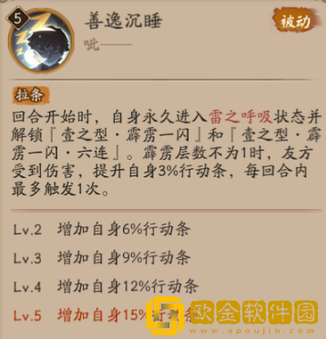 回合开始时,自身永久进入【雷之呼吸】状态并解锁「壹之型·霹雳一闪」和「壹之型·霹雳一闪·六连」。【霹雳】层数不为1时,友方受到伤害,提升自身3%行动条,每回合内最多触发1次。