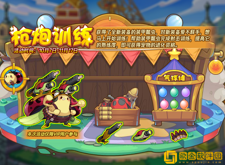 有了全新装备的装甲瓢虫,对新装备爱不释手,想马上开始训练!帮助装甲瓢虫完成射击训练,提高它的熟练度,即可获得宠物的进化资格。(本活动仅限VIP用户参与)