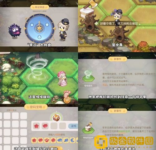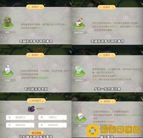 果树、神秘的金斧头、创造使、怪怪旋风、幽灵、神奇帽子(答题)、幸运转盘,不同时间产生不同效应!有好有坏!