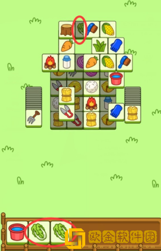 当场面上没有能够达成3消的卡* 时,我们可以观察位于下层暂时无法使用的卡* ,在点击上层卡* 后,下方的卡* 便可以使用了(如图中红圈内的白菜),这样我们就能消除一组白菜,但是在使用这个技巧时要避免手中无用卡* 堆积起来最终导致游戏失败。