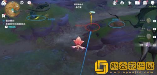 4.参照物及其大致位置如图:左边有复苏花灵,右边有处枯草,点位在两者之间的石头上空,蓝色箭头为水平方向,黄色箭头为垂直方向。