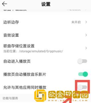 4、在设置页面,找到并启用允许与其他应用同时播放,这样就可以了。