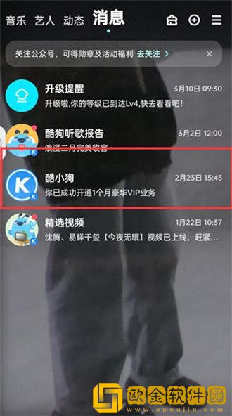 欧金软件园小编为您分享的酷狗音乐怎么取消关注的人?大多数的小伙伴都会使用酷狗音乐来听歌,而在软件中不仅拥有用户在使用,很多歌手也会在软件中开通账号来发布歌曲,如果用户想要了解其他用户的动态信息,就会选择去关注对方,这样对方发布新歌软件都是会通知用户来听的,而有的时候用户会因为有些事情而不想再去关注一些人,这时候就可以选择取消关注对方,但有的小伙伴还不知道要怎么取消关注,不要着急,下面就让小编来给各位小伙伴分享一下酷狗音乐怎么取消关注的人吧!