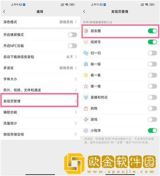 2、点击【发现页管理】,取消【朋友圈】右侧开关。