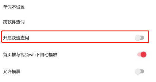 3、找到“开启快速查词”功能,把后面的按钮点亮选择打开即可。